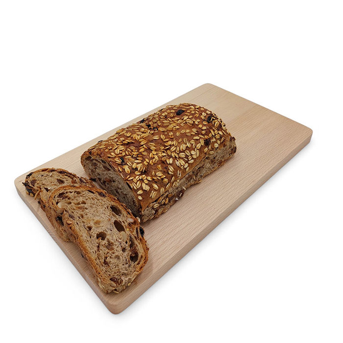 tarwebloem (27.92 %), water (27.92 %), volkorentarwemeel (13.82 %), roggebloem (4.65 %), gist (4.65 %), cashewnoten (cachewnoten) (3.49 %), rozijnen (2.91 %), hazelnoten (2.33 %), boter (concentraat) (melk) (1.40 %), tarwegluten (1.40 %), suiker (1.40 %), weipoeder (melk) (1.40 %), abrikoos (1.16 %), bakkerszout (0.93 %), veldbonenmeel (0.65 %), pecannoten (0.58 %), appel (0.58 %), amandelen (0.58 %), aardappelzetmeel (0.47 %), roggebloem (voorverstijfseld) (0.37 %), emulgator(E471 (0.37 %), E481 (0.09 %), E472e), tarwebloem (voorverstijfseld) (0.28 %), glucosestroop (0.28 %), melkeiwit (0.19 %), plantaardige olie(zonnebloem, raapzaad (0.09 %)), verdikkingsmiddel(E412 (0.09 %)), tarwemoutmeel, enzymen, gerstemoutextract, roggemoutmeel, rijstebloem, aroma, dextrose, lactose (melk), kaliumjodide, antiklontermiddel(E535), kleurstof(E100), meelverbeteraar(E920)