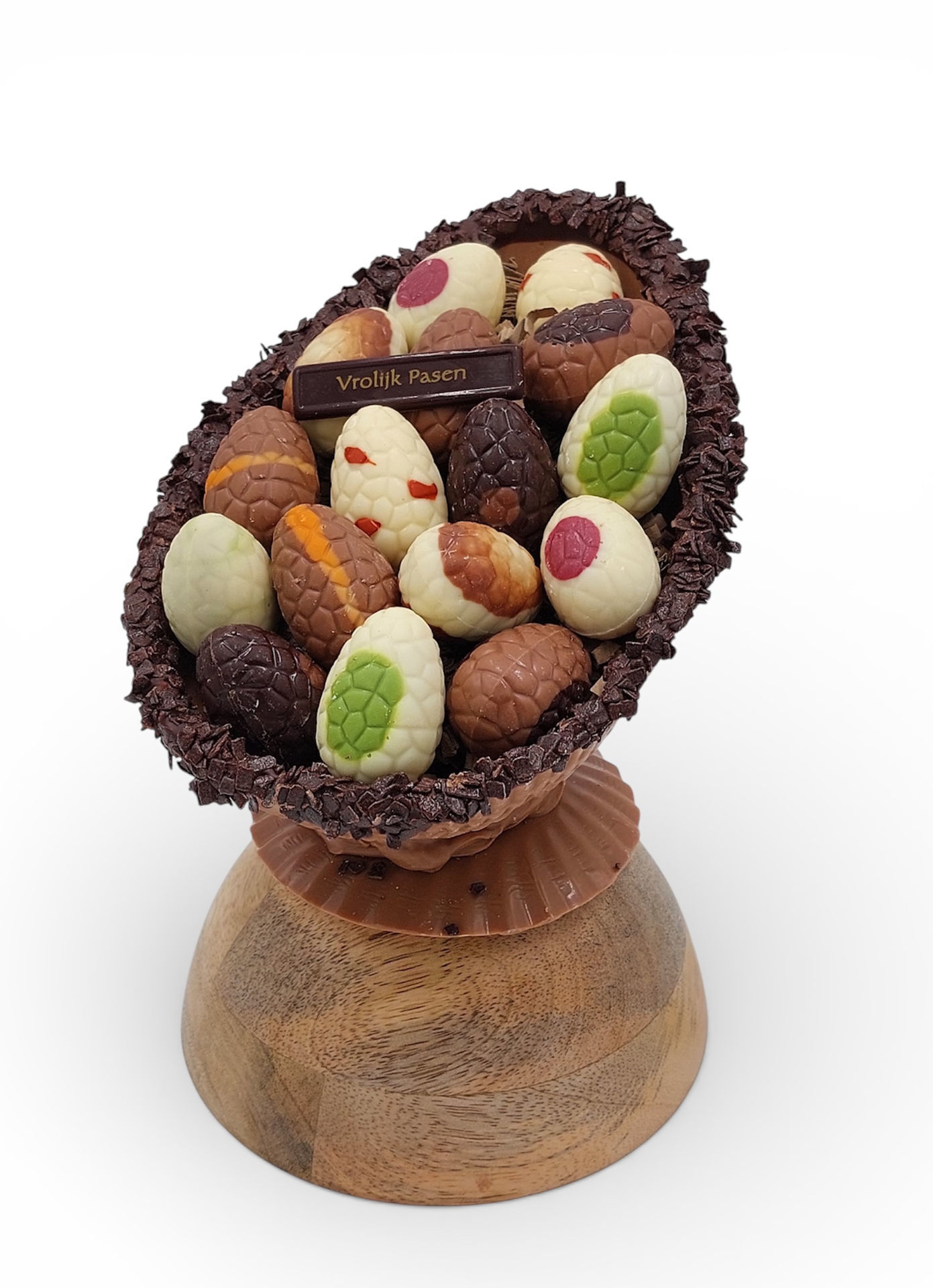 Eierschaal schuin op voet gemaakt van Callebaut chocolade melk en gevuld met diverse soorten gevulde paaseitjes WILT U ER MEER DAN 2 BESTELLEN?! DIT IS MOGELIJK MAAR WILT U HIEROVER TELEFONISCH CONTACT MET ONS OPNEMEN.