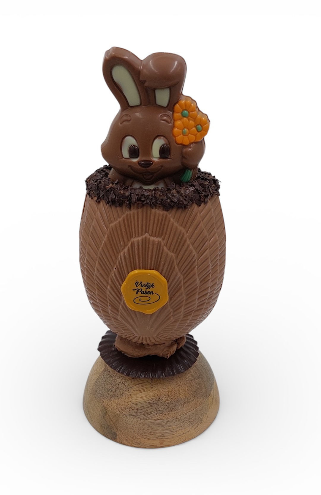 Chocolade holfiguur "haasje" verstopt in ei op voet gemaakt van Callebaut chocolade melk WILT U ER MEER DAN 2 BESTELLEN?! DIT IS MOGELIJK MAAR WILT U HIEROVER TELEFONISCH CONTACT MET ONS OPNEMEN.