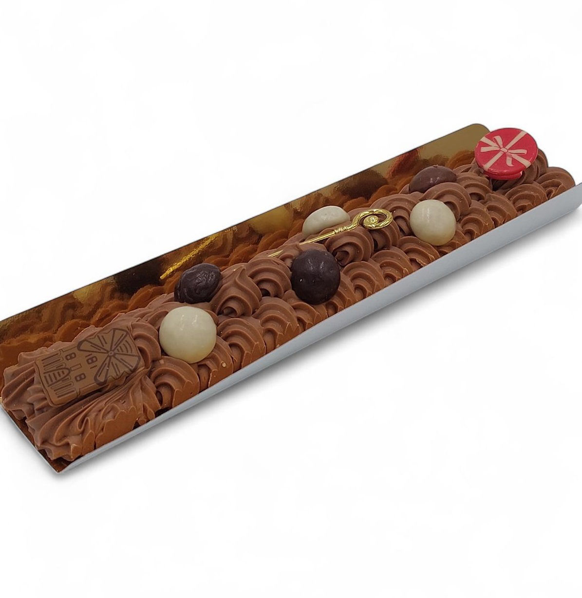 Met de hand gespoten staaf, van Callebaut chocolade en afgewerkt met Sinterklaasdecoratie