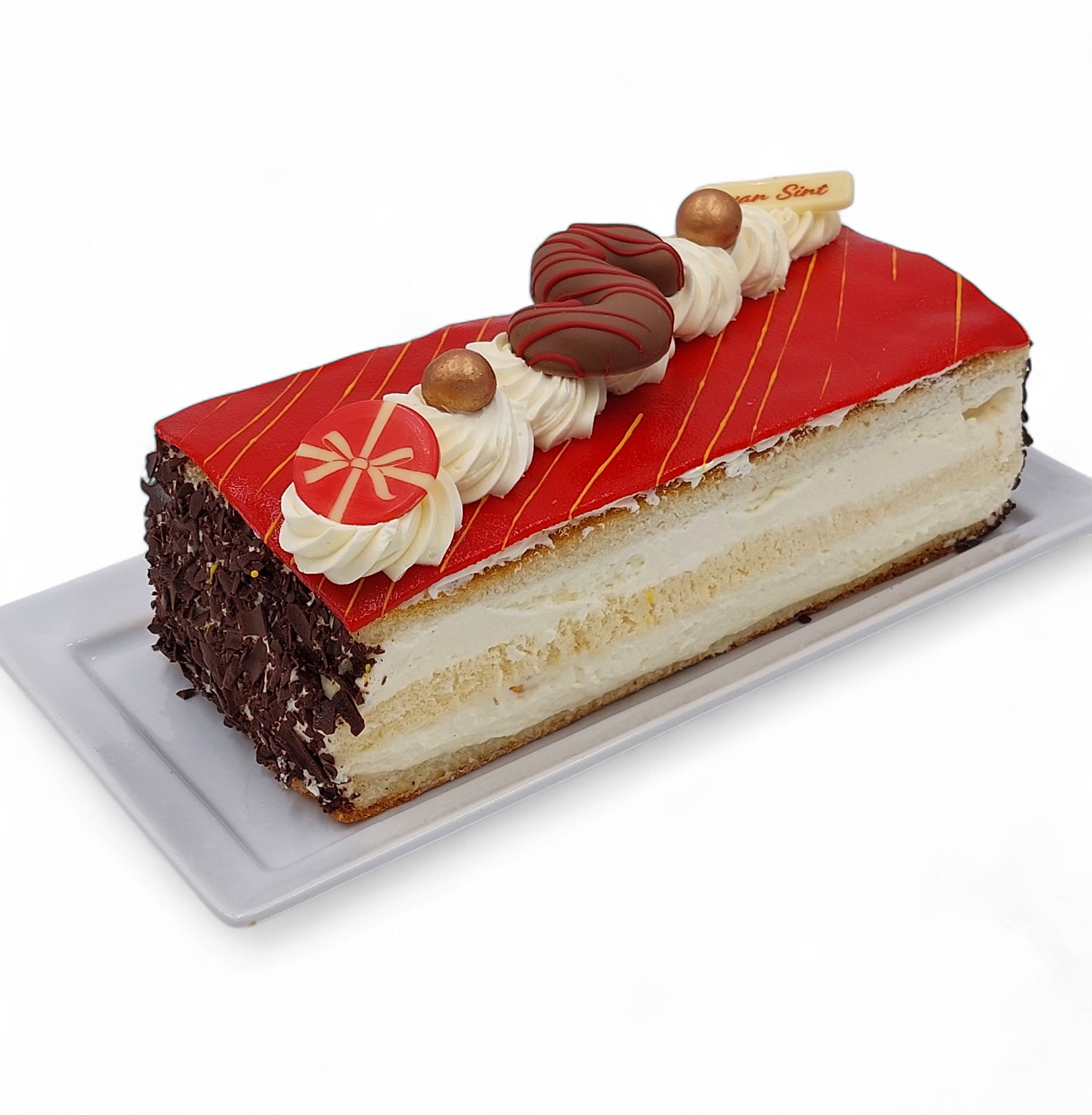 Biscuit gevuld met Zwitserse room, cocktail fruit, rum rozijnen en bitterkoekjes, afgewerkt met een rode marsepein, crème en Sinterklaasdecoratie