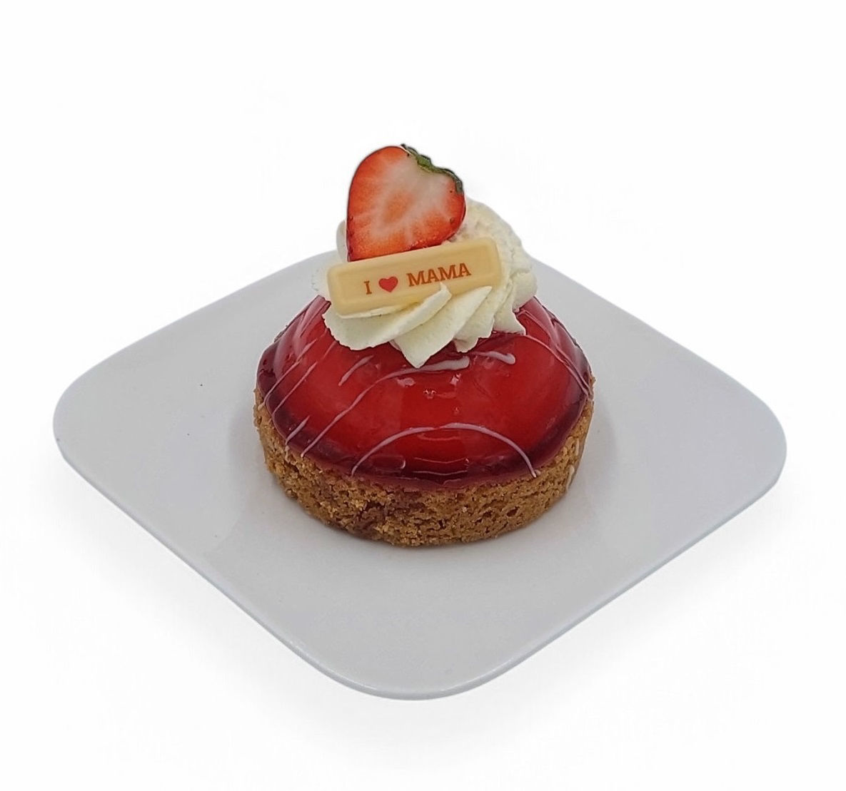 Sloffenbodem gevuld met frambozenbavarois en frambozencompote en afgewerkt met een rode spiegel en decoratie voor moederdag
