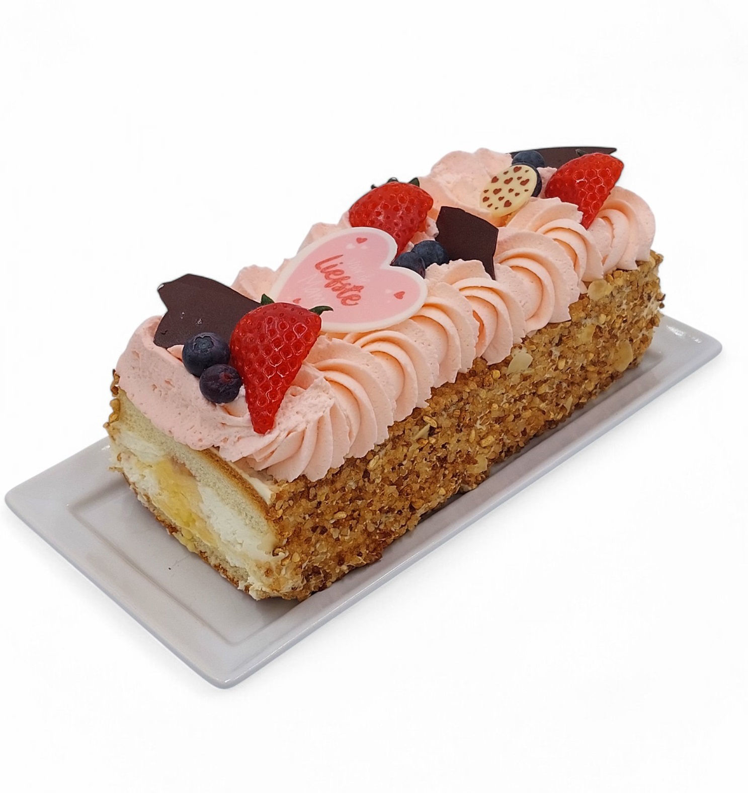 Biscuit gevuld met luchtige slagroom, frambozen bessenjam en Zwitserse room en afgewerkt met nootjes, luchtige (roze) slagroom, rood fruit en decoratie voor moederdag
