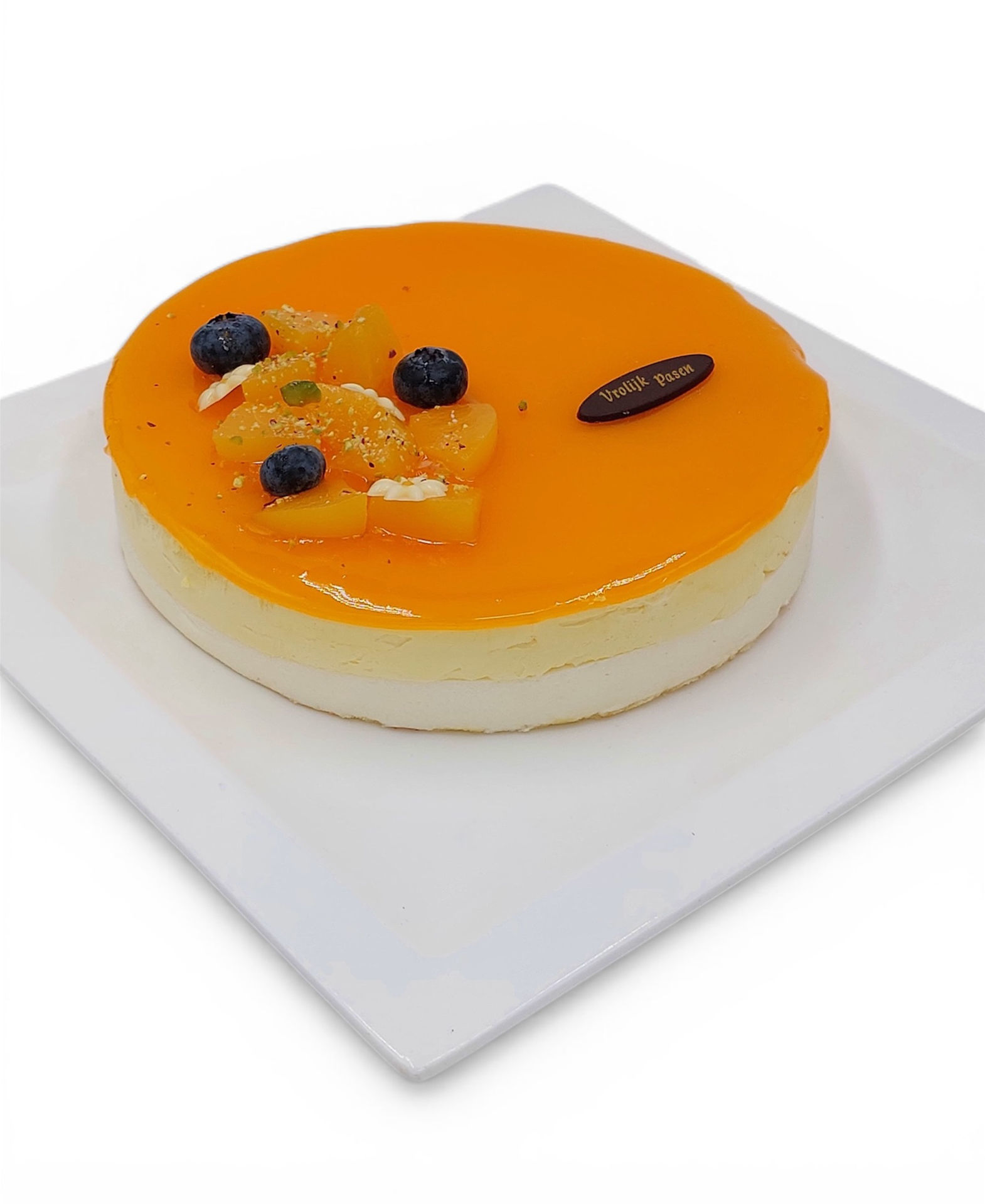 Vanille bavarois en perziken bavarois en een laagje luchtige biscuit op een harde wenerbodem. Afgewerkt met een spiegel van perzik-abrikoos en gedecoreerd met blokjes perziken.