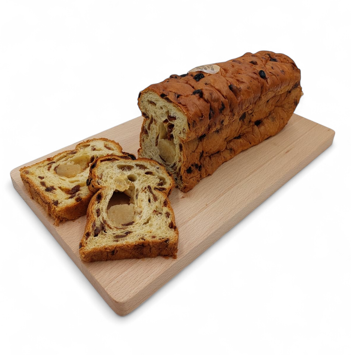 tarwebloem (32.69 %), rozijnen (27.62 %), water (26.66 %), gist (3.17 %), suiker (2.14 %), amandelen (1.95 %), dextrose (1.90 %), tarwegluten (1.27 %), bakkerszout (0.63 %), lactose (melk) (0.38 %), emulgator(E471 (0.38 %), E482 (0.13 %), E472e (0.06 %)), plantaardige olie(raapzaad (0.38 %), zonnebloem (0.11 %), katoenzaad (0.03 %)), melkeiwit (0.32 %), plantaardig vet(palm (0.06 %)), eipoeder (0.05 %), glucosestroop (0.05 %), tarwezetmeel, veldbonenmeel, enzymen, tarwemoutmeel, kaliumjodide, ei-eiwit (gedroogd), citroenvezel, antiklontermiddel(E535), conserveermiddel(E202), kruiden en specerijen(curcumapoeder), meelverbeteraar(E920), natuurlijk aroma(sinaasappel, citroen), rijsmiddel(E500)
